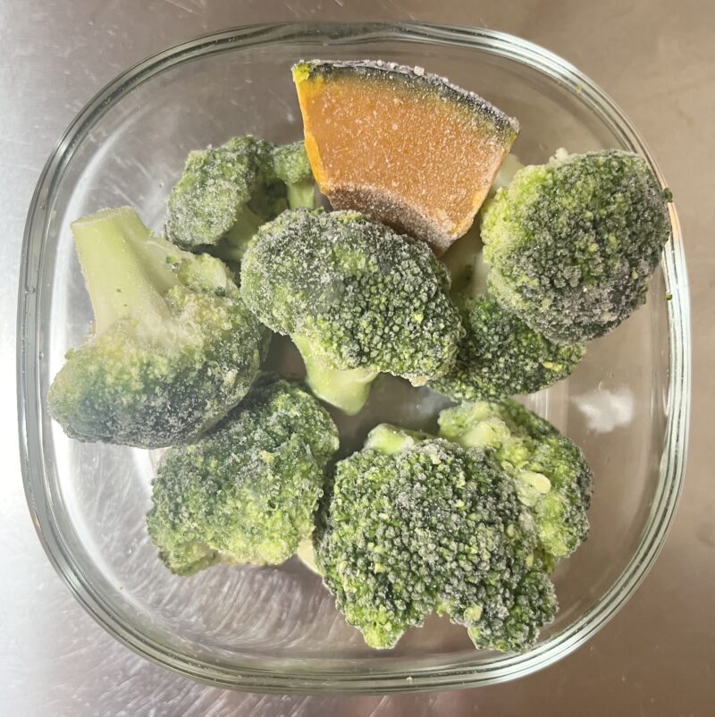 ❶ 耐熱容器に冷凍かぼちゃと冷凍ブロッコリーを入れて、ふんわりラップをしてレンジ(500w)で2分30秒チン