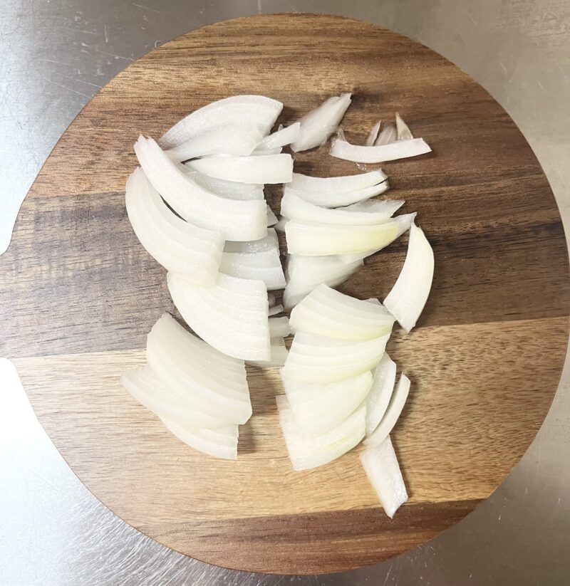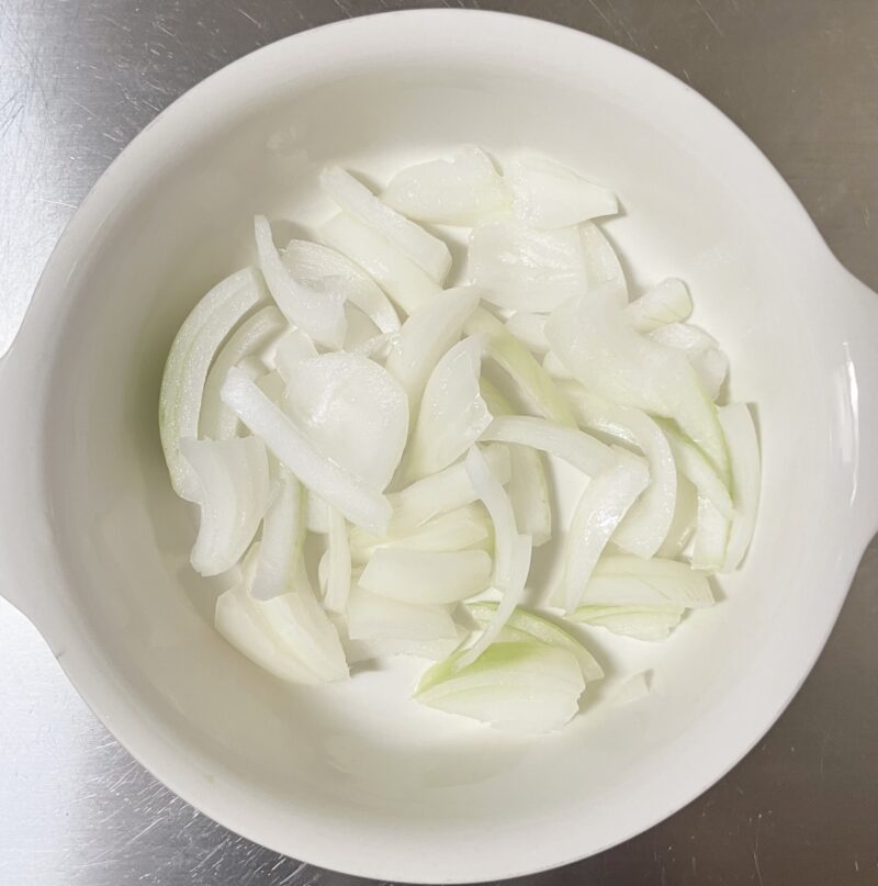 ❷ 玉ねぎ1/4個は薄切りにして、半分に切る