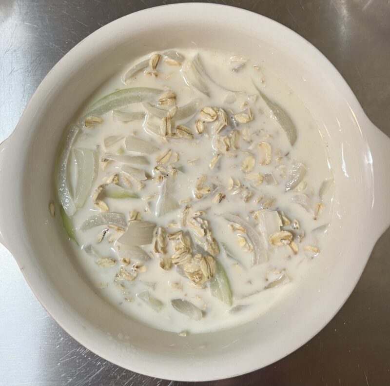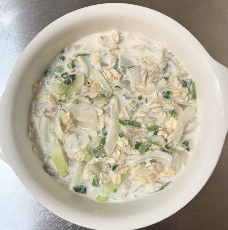 ❹ オートミール40gとホワイトソース用調味料(牛乳100ml、鶏がらスープの素小さじ1、めんつゆ小さじ2)を加えて、ラップをせずにレンジで2分半チン
